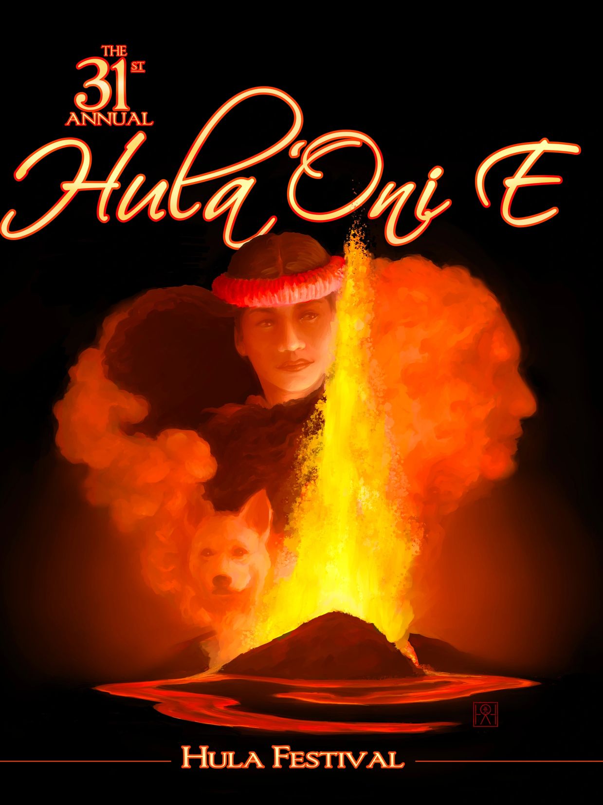 Seen throughout the image are kinolau of Pele in volcanic phenomena - eruptions, lava, fire, and fiery volcanic clouds of smoke - of which Pele is provider and controller. The tall fountain of lava in the center of the image has a tall, straight central column representative of Pele’s Oʻo, used in her journey throughout the islands to dig pits into the earth in an effort to create a suitable home for her and her family. From her origin in Polapola, Pele ultimately finds rest in her current home in Halemaʻumaʻu, Hawai’i.